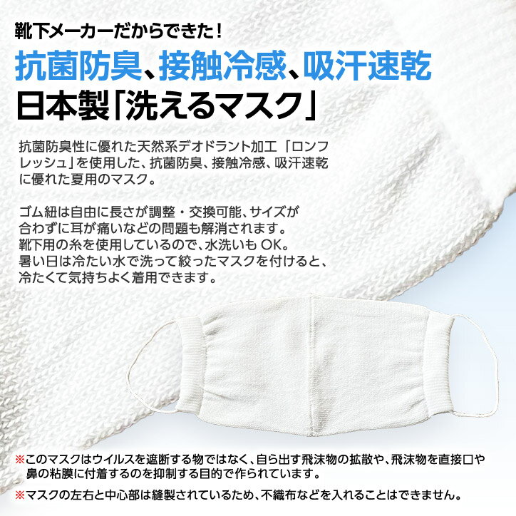 靴下メーカーの洗えるマスク 抗菌防臭・接触冷感・吸汗速乾 日本製の解説 靴下メーカーが作った、日本製の抗菌防臭・接触冷感・吸汗速乾繊維を使用した洗えるマスク。